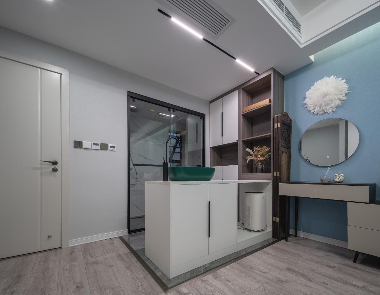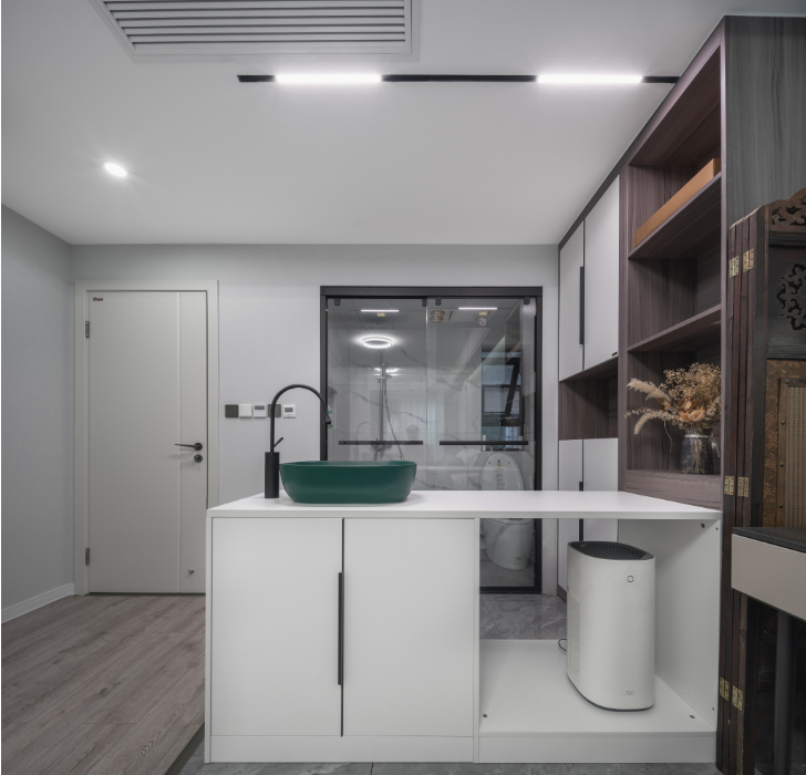不同于卫生间的二分离、三分离设计,卧室做岛台最主要是为了满足基本起居洗漱需要。可以连接墙面或者立柜做一个延伸式岛台,台上盆搭配收纳柜,一个小型开放式室内盥洗区就完成啦,既省钱还方便。