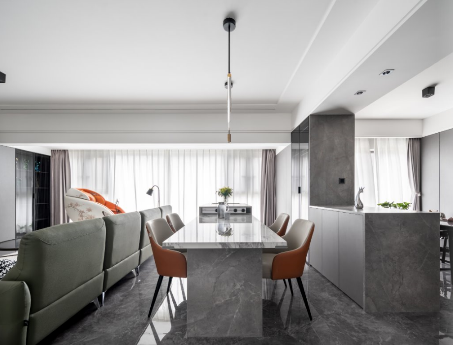 可以说是延伸式岛台最常见的设计方法。将餐桌与岛台连为一体,餐桌还是以吃饭为主,岛台可增设水槽、插座、洗手台等等,不仅可以满足洗菜洗手,同时可以充电、煮火锅等,丰富餐厅功能,让动线集中不琐碎。